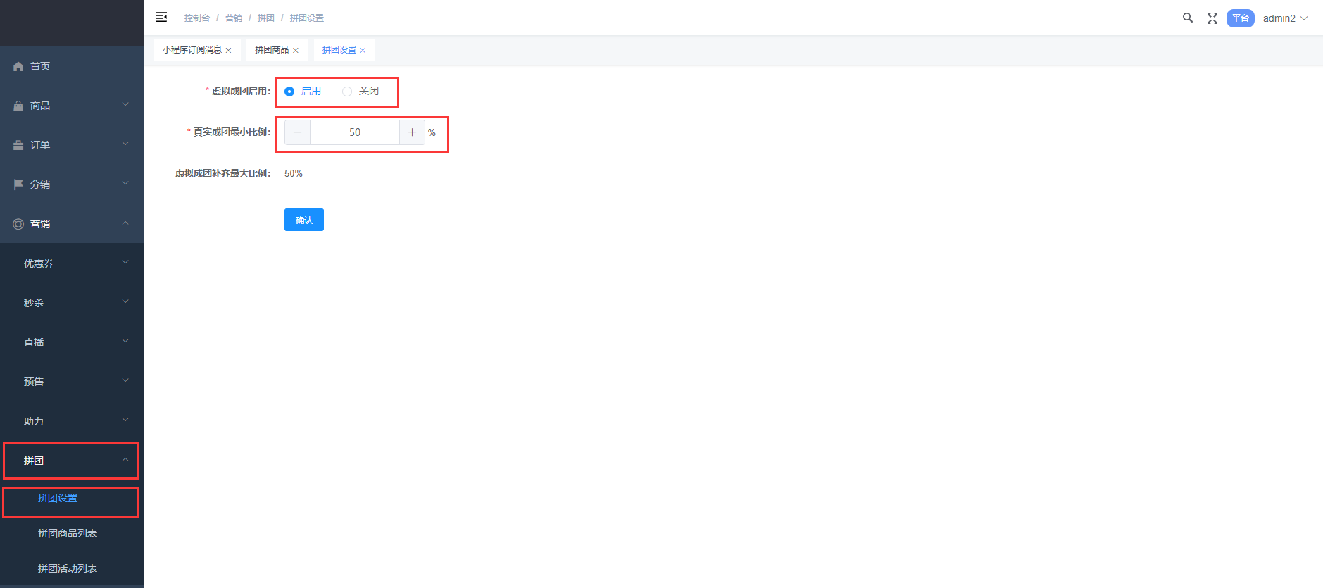确认是否开启虚拟拼团,如果开启,可在平台后台先开启虚拟拼团,并设置相应虚拟成团比例,平台开启并设置后,该设置比例适用于所有子商户。