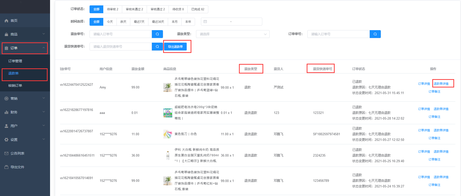 同一商户同一商品一次购买多个,发货后用户端申请部分退货或全部退货退款,可点击“查看退款单”处理退款