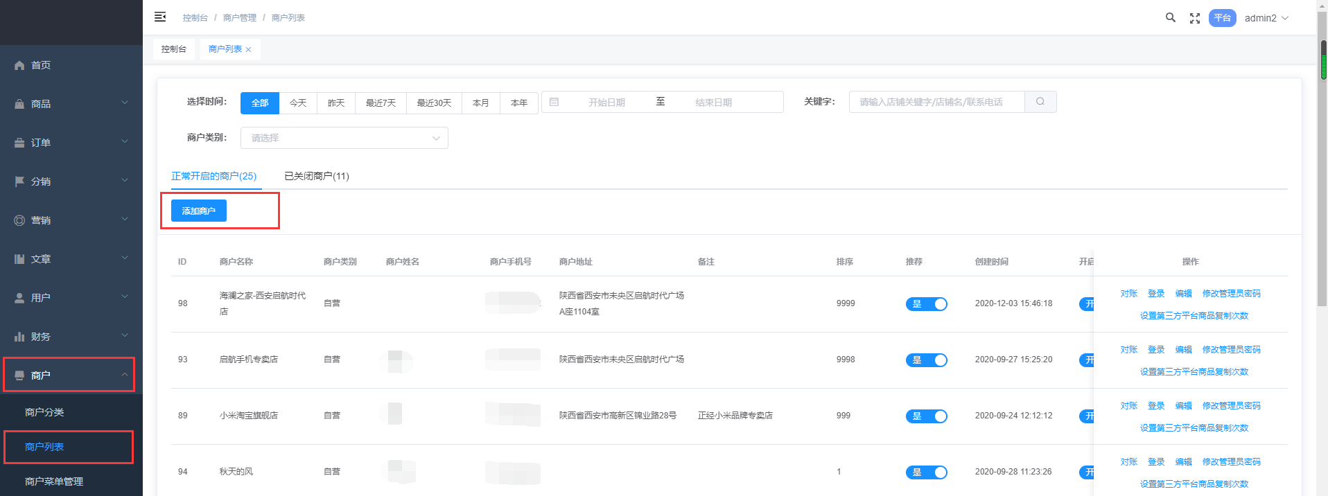 **是否自营**:可设置该商户是否为自营店,开启为自营,移动端及平台后台与该商户相关的商品、优惠券、订单都会显示自营标识,关闭则为非自营店,其店铺相关信息均不展示自营标识。