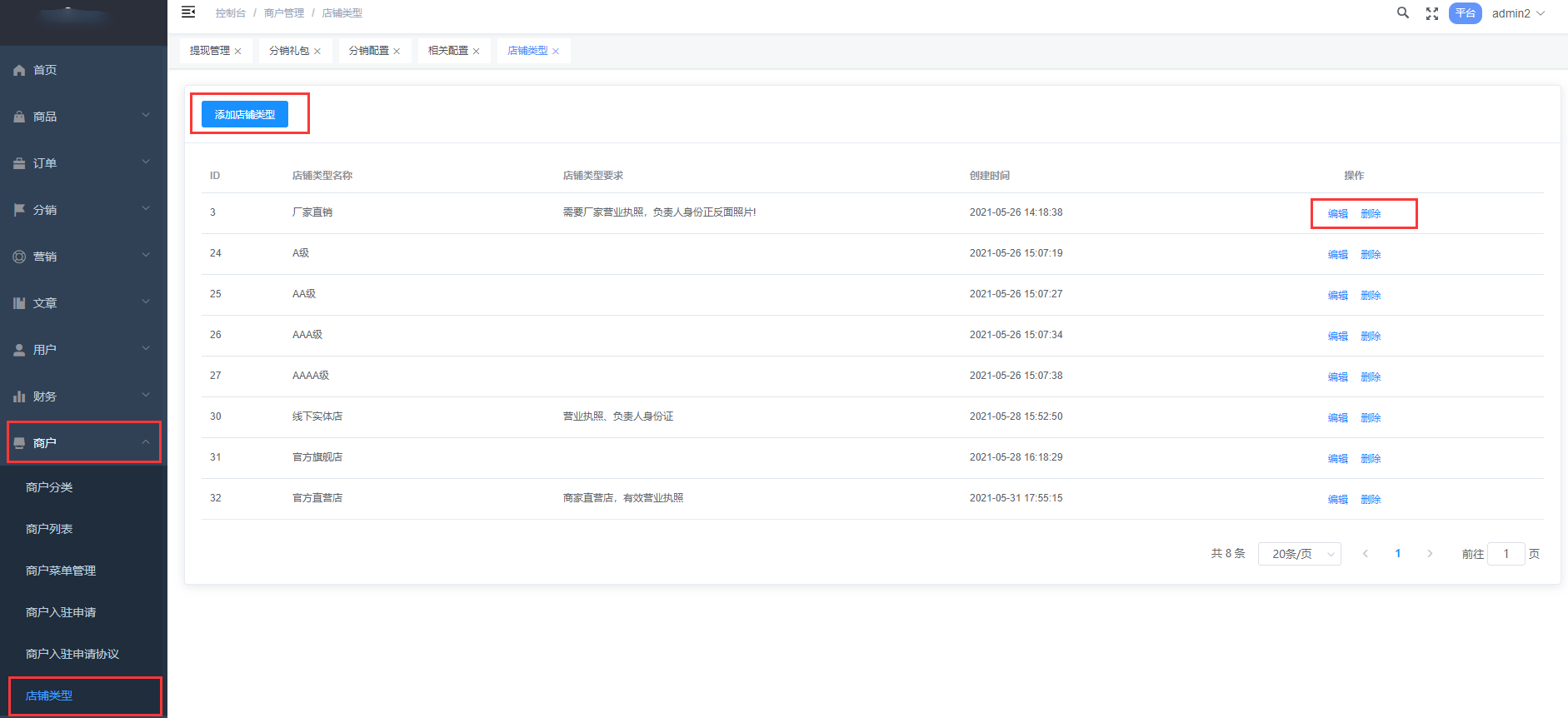 1. 平台后台可自定义店铺类型,商户入驻平台时可选择相应的店铺类型或不选,选择后店铺与商品在移动端能看到店铺类型标签,不选择店铺类型则不展示标签;