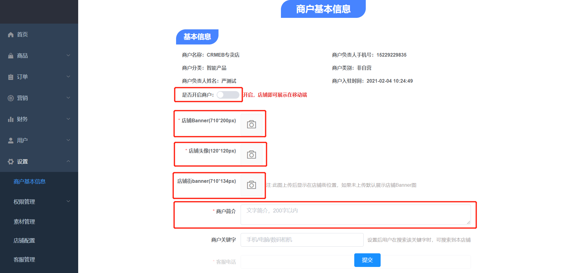 (3)填写完所有商户信息后,请点击开启商户,开启:该商户会在移动端展示;关闭:则不展示;