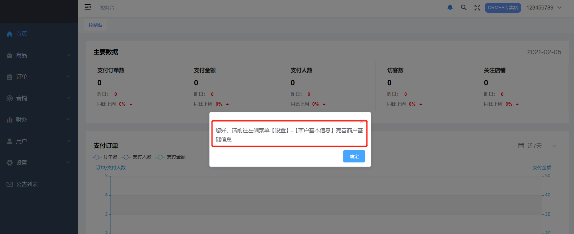 1. 商户入驻申请成功后,商家初次登录后台,第一步提醒先完成商户基本信息,再进行其它操作;点击确定,自动跳转到该页面。