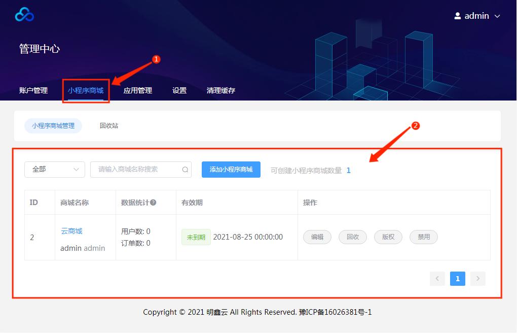 #### 第五步:管理自己已创建的小程序商城,点击对应商城名称,进入系统配置与管理