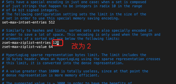 在执行命令之前,我们先把配置文件中的参数`zset-max-ziplist-entries`修改为`2`: