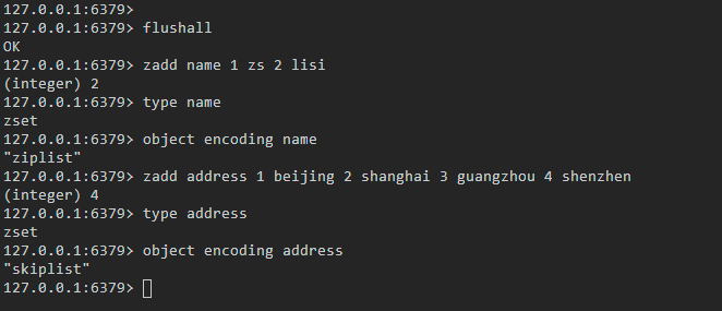 zadd address 1 beijing 2 shanghai 3 guangzhou 4 shenzhen //设置4个元素则会使用 skiplist编码