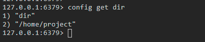 * `dir`:`rdb`文件生成目录。默认是`./`(当前安装目录),可以执行命令`config get dir`进行查看,如下图所示说明当前`dump`文件生成目录为`/home/project`: