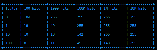 可以看到,当对数因子`lfu_log_factor`为`100`时,大概是`10M(1000万)`次访问才会将访问`counter`增长到`255`,而默认的`10`也能支持到`1M(100万)`次访问`counter`才能达到`255`上限,这在大部分场景都是足够满足需求的。
