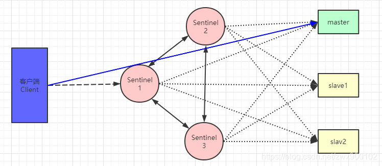 `Sentinel`机制下,客户端应该怎么连接上`master`服务呢?因为`master`是可能改变的。所以在`Sentinel`机制下,客户端需要连接上`Sentinel`服务,然后从`Sentinel`服务获得`master`节点的地址进行连接。如下图所示: