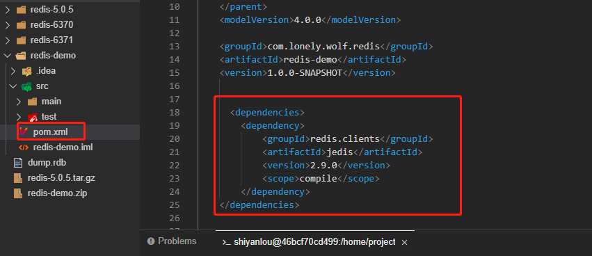 2. 打开`redis-demo`文件夹,找到`pom.xml`文件,引入如下`pom`依赖: