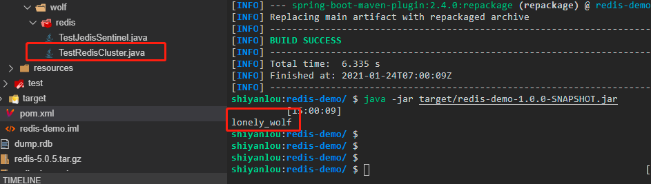 1. 还是在上一个实验的`redis-demo`内的`src/main/java`目录下的`com.lonely.wolf.redis`包内新建一个测试类`TestRedisCluster.java`进行测试: