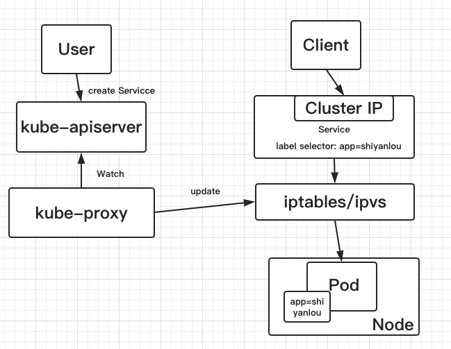 * `ClusterIP`:这是一个虚拟地址(VIP),没有实际的网络设备承载这个地址,它的底层实现原理是依靠 kube-proxy 通过 iptables 规则重定向到 Node 节点的端口上,然后再负载均衡到后端 Pod。具体过程为:kube-proxy 发现新 Service,在 Node 节点上打开一个任意的 nodePort 端口,创建对应的 iptables 规则或是 IPVS 规则,重定向 Service 的`ClusterIP:port`到新建的 nodePort 端口上,然后开始处理关于新 Service 的连接访问。