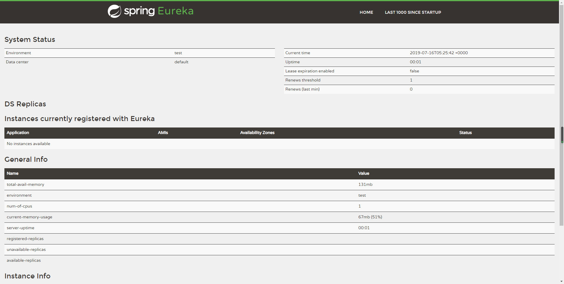 2019-03-15 10:46:17.373 INFO 3658 --- [ Thread-13] e.s.EurekaServerInitializerConfiguration : Started Eureka Server