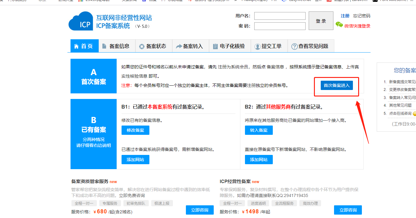 2、根据情况选择备案条件(这里以首次备案介绍)