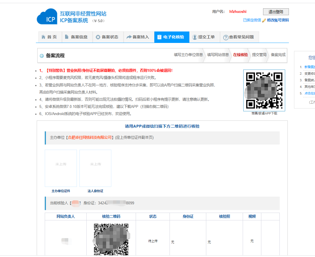 8、电子化核验:上传身份证信息和下载授权书签字打印并上传【用微信扫下面的二维码,阅读拍摄须知后上传营业执照(只能拍摄)和身份证(只能拍摄),在微信小程序上,上传资料后会自动跳转到视频页面,按照指示录入视频(堵数字且背景为纯色,如白色背景)】