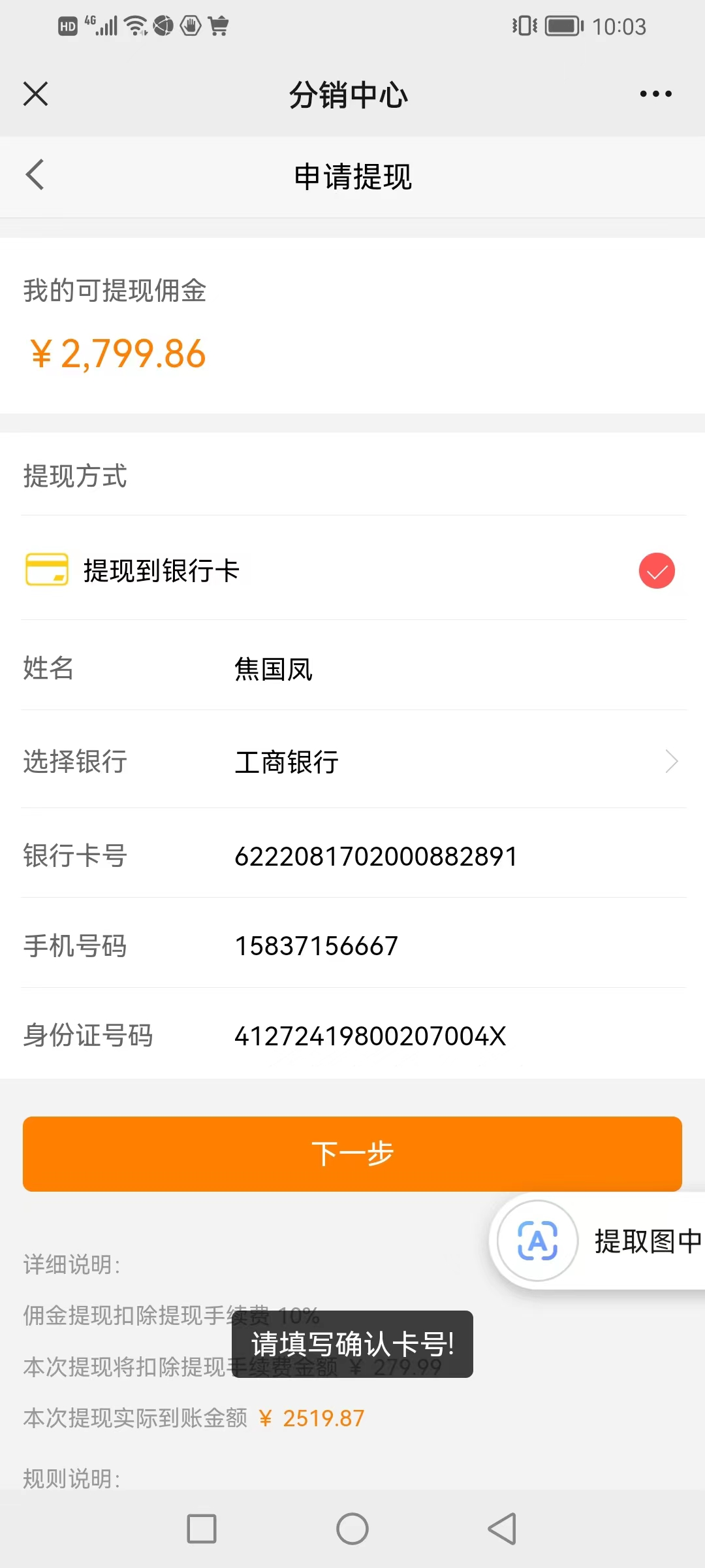 **问题1:**提现申请填写卡号后提示【请填写确认卡号】(见下图),