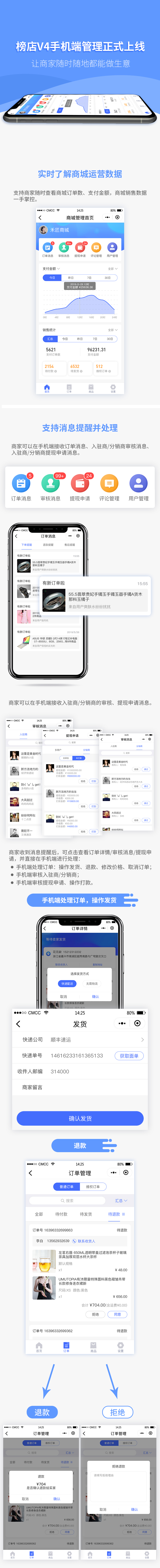 为了满足商家在手机移动端进行商城运营管理的需求,现推出商城V4手机端管理功能,支持商家在手机端管理商品、用户、接收订单消息等等,**随时随地都能处理买家订单,****高效解决了商家外出、电脑不在身边导致无法管理商城的难题,让商家随时随地都能做生意,商城运营效率UP!!!**