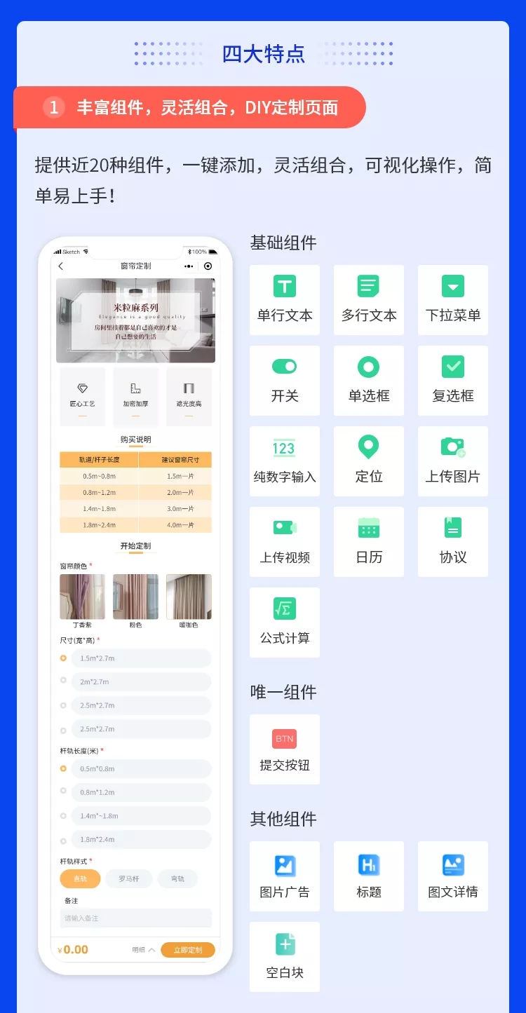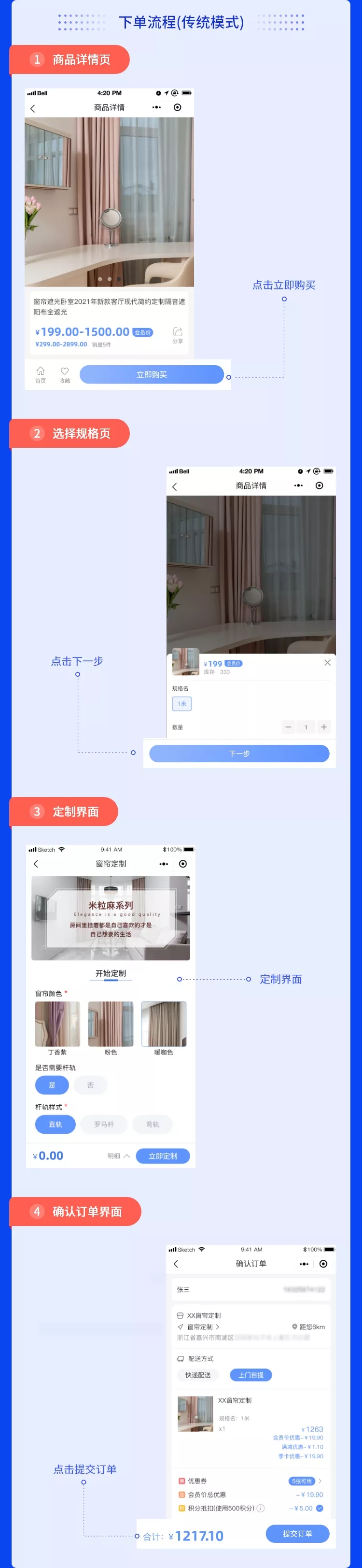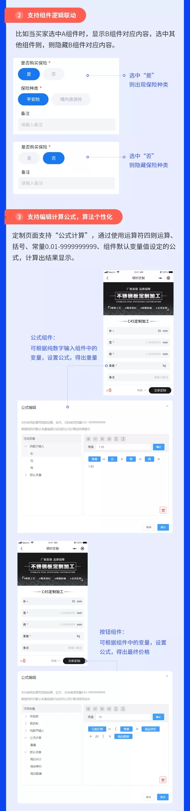 在用户购买“定制商品”时,额外补充定制页面,收集用户个性化数据,如西服定制、商务礼盒定制LOGO、工业材料定制……满足各行各业,各类特殊商品销售需求。