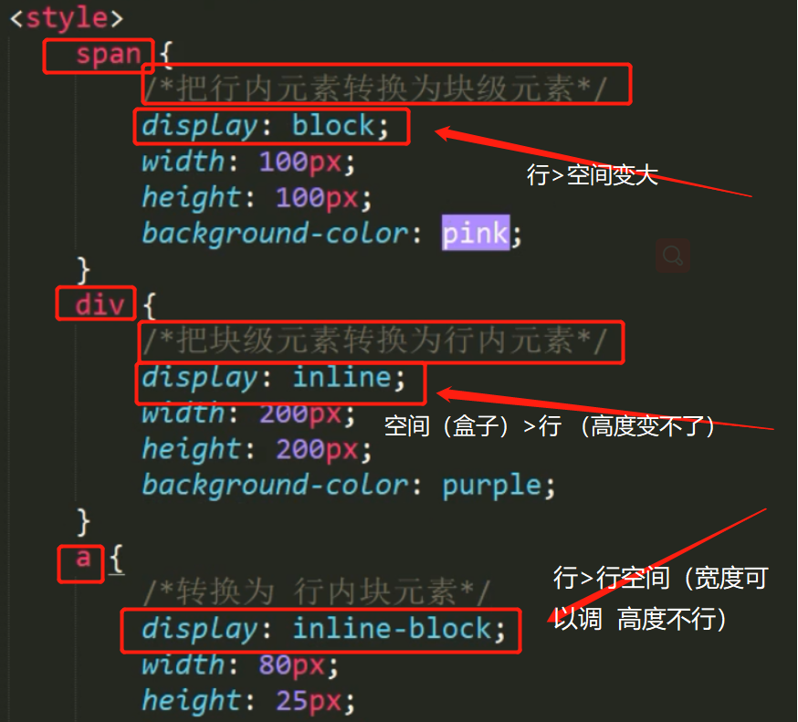 ●行内转块:**display:block**; 空间改变**(常用 重点)**