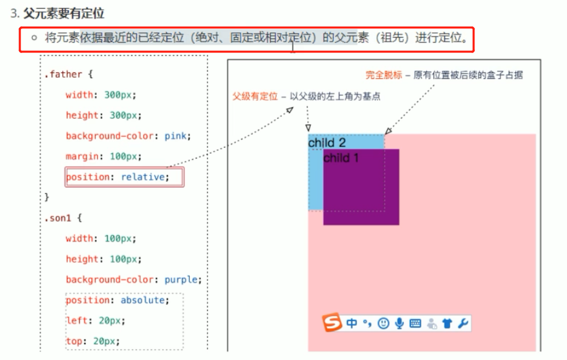 因为绝对定位的盒子是拼爹的,所以要和父级搭配起来使用。