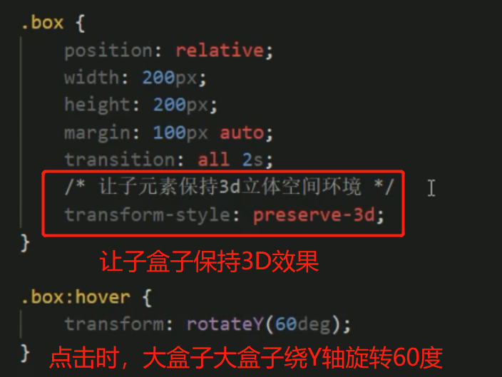 ●transform- style: preserve- 3d;**子元素开启立体空间**(保持子元素3D效果)