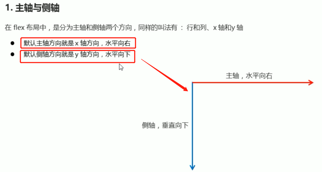 注意:主轴和侧轴是会变化的,就看**flex-direction**设置**谁为主轴**,**剩下的就是侧轴**。而我们的**子元素**是**跟着主轴来排列**的