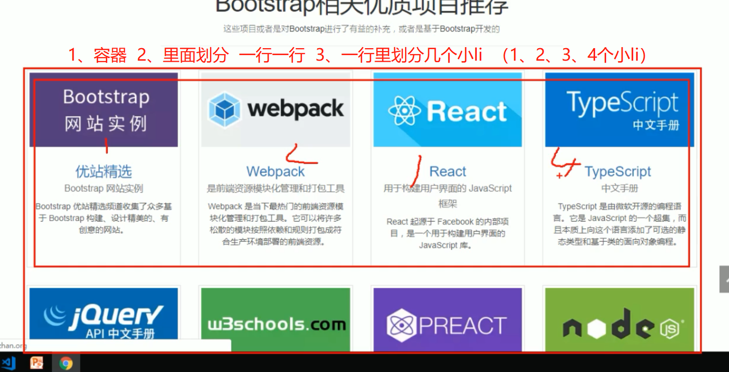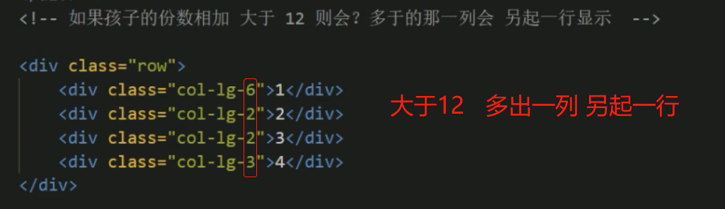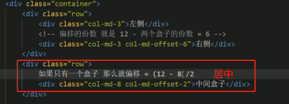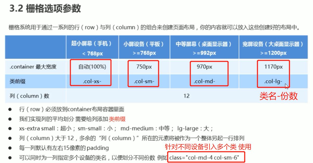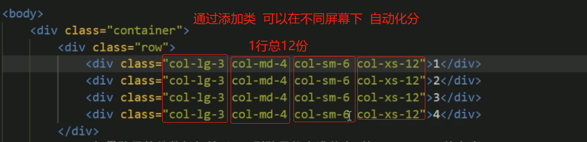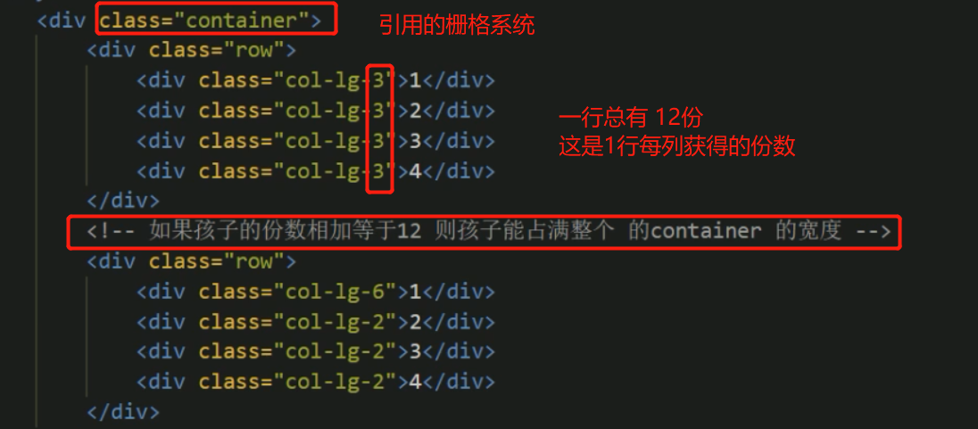## 容器类名=container 每行类名div=row 每列类名="col-1g-3" 这是屏幕>=1200px 引用的 3是(一行总12份)其中的3份