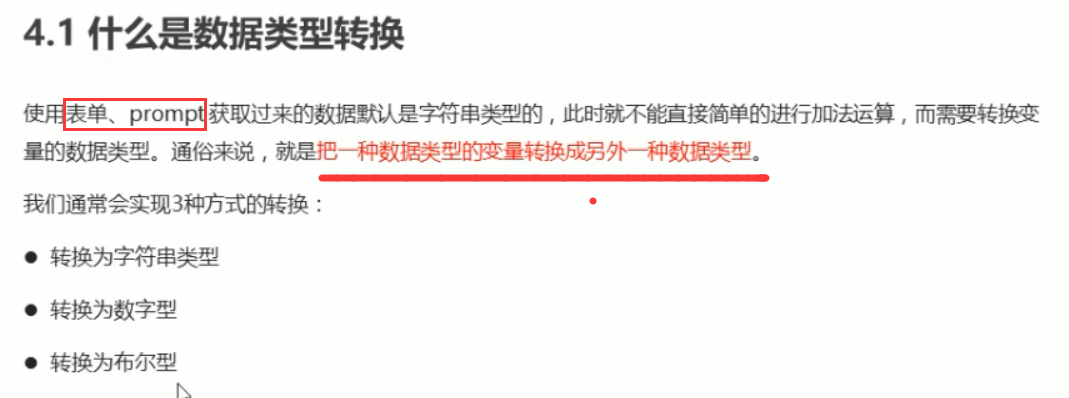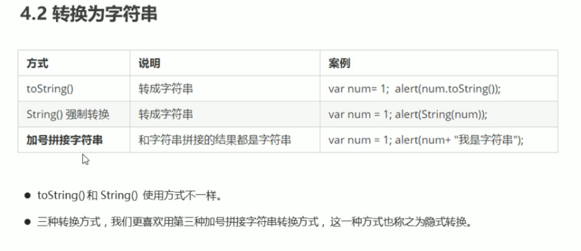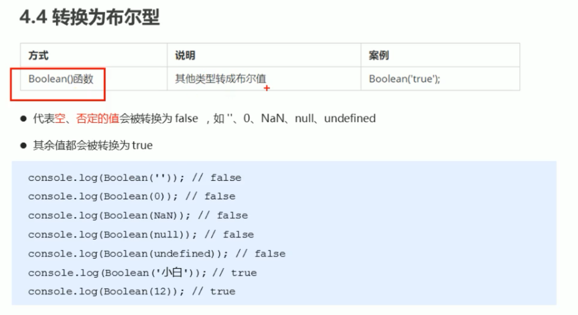 | Boolean( )函数 | 其他类型转成布尔值 | Boolean('true');|