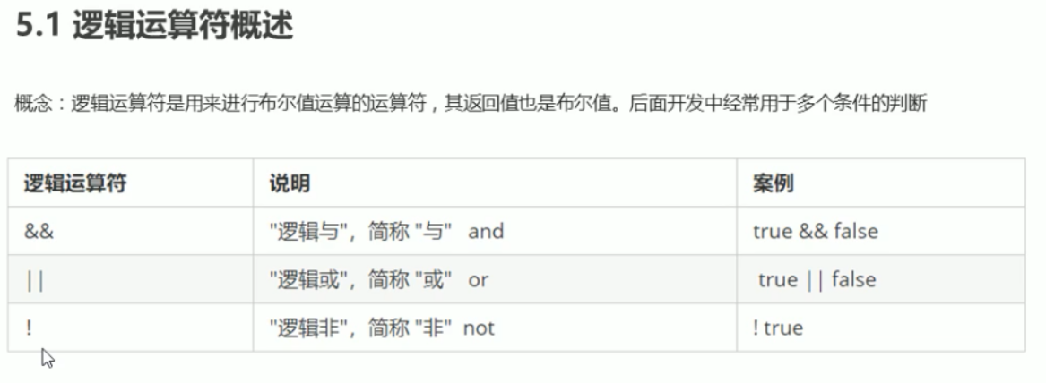 概念:逻辑运算符是用来进行布尔值运算的运算符,其返回值也是布尔值。后面开发中经常用于多个条件的判断
