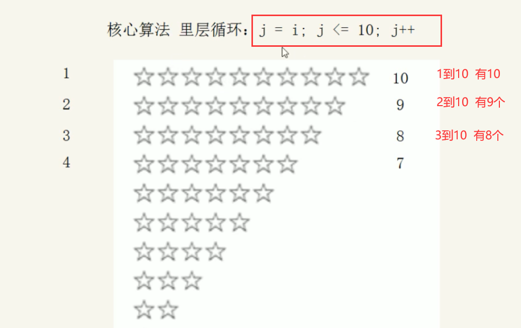 3.**外层循环**循环**一次**,**里面的循环执行全部**