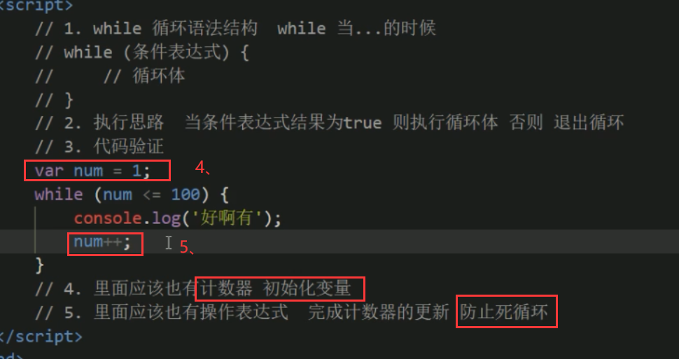 ③循环体代码执行完毕后,程序会继续判断执行条件表达式,如条件仍为true ,则会继续执行循环体,直到循环条件为false时,整个循环过程才会结束
