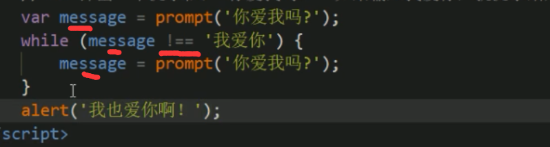 3.弹出一个提示框, 你爱我吗? 如果输入我爱你,就提示结束,否则,一直询问