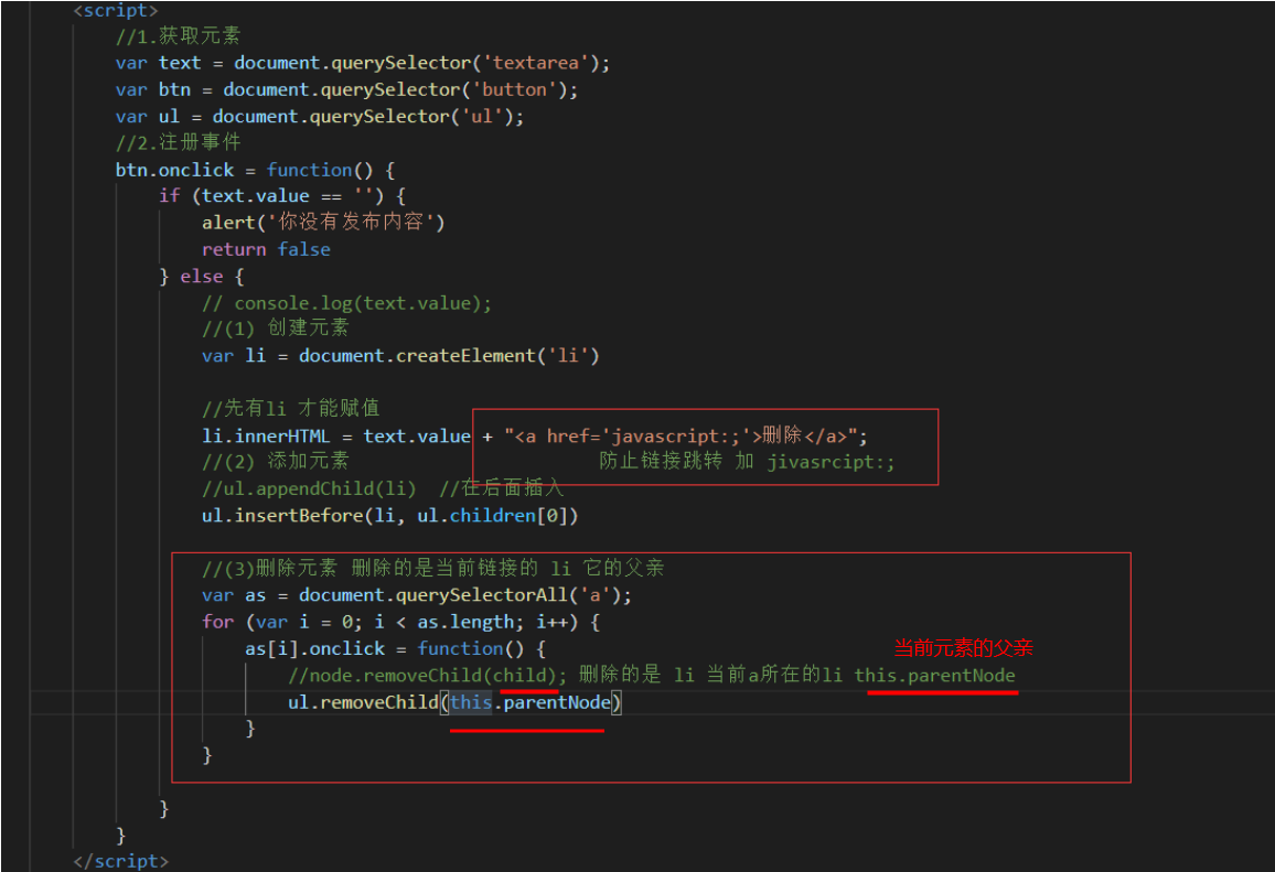 ①当我们把文本域里面的值赋值给Ii的时候,多添加一个删除的链接