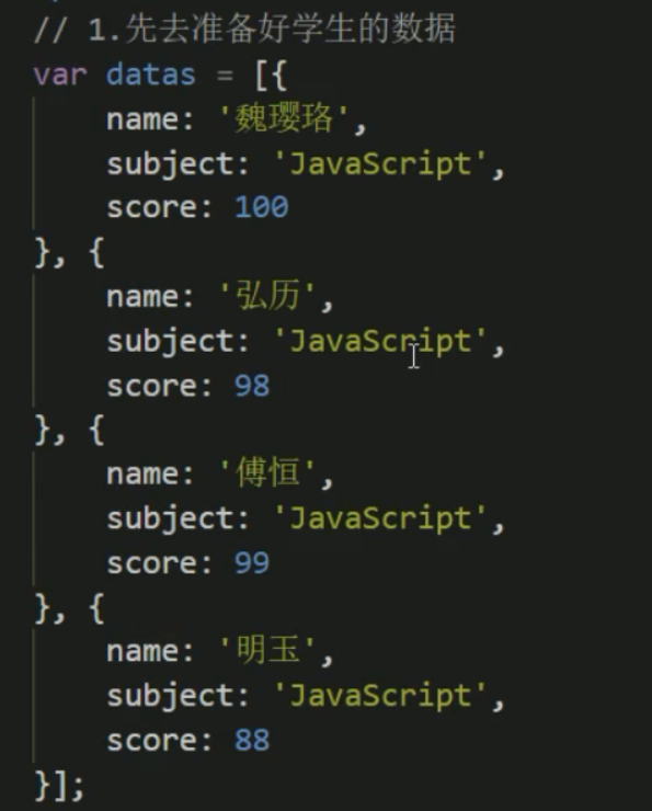 //2.行里面创建单元格(跟数据有关系的3个单元格)td单元格的数量取决于每个对象里面的属性个数 for循环遍历对象datas [i]