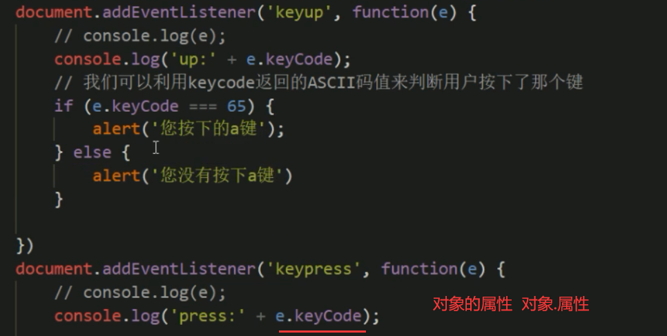 //键盘事件对象中的keyCode属性可以得到相应键的ASCII码值