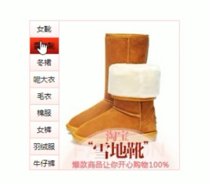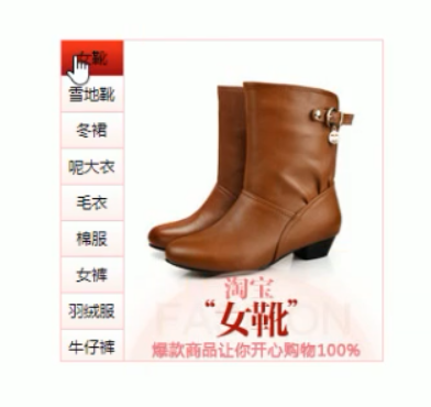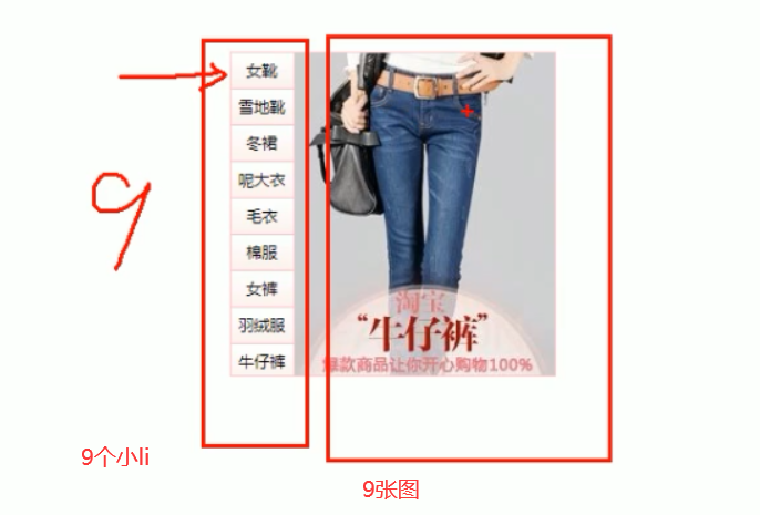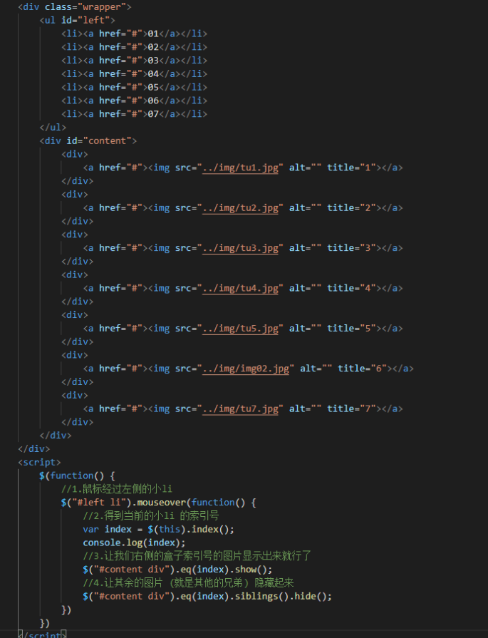 ①核心原理:鼠标经过左侧盒子某个小li ,就让内容区盒子相对应图片显示,其余的图片隐藏。