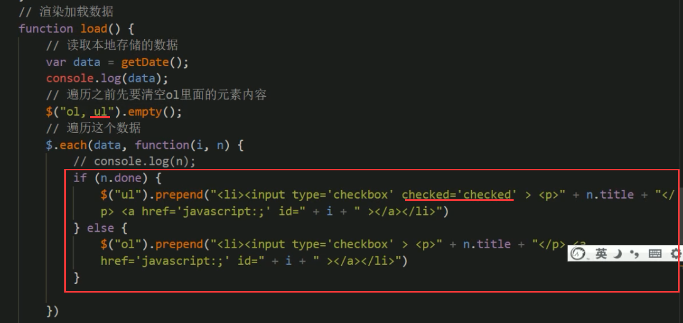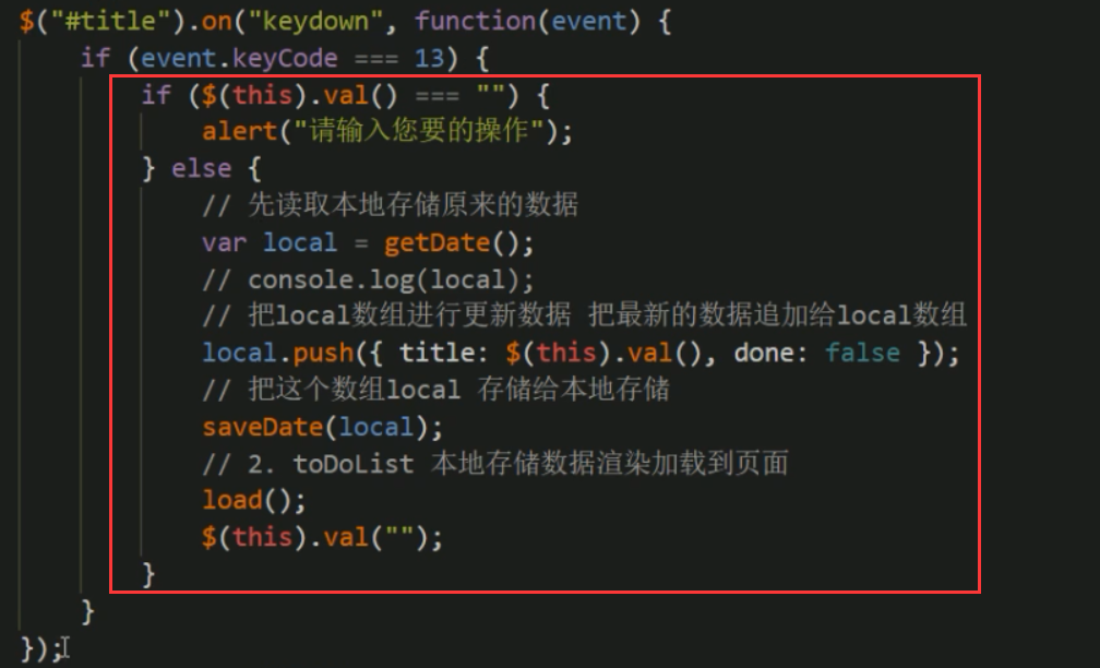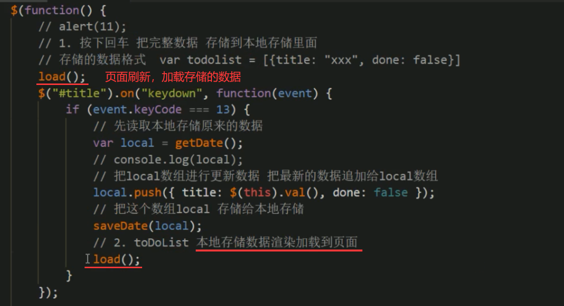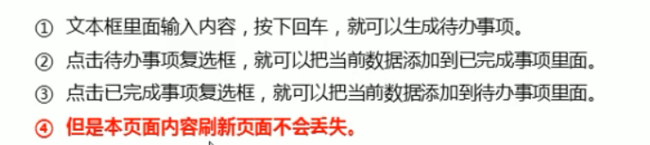 ②核心思路:不管按下回车,还是点击复选框,都是把本地存储的数据加载到页面中,这样保证刷新关闭页面不会丢失数据