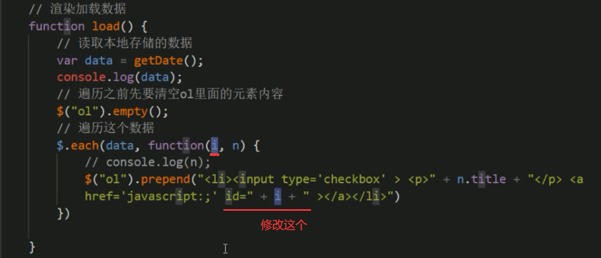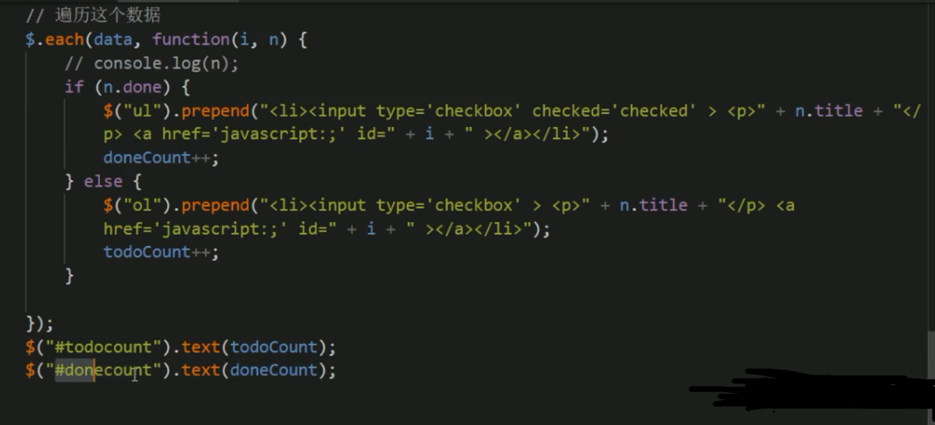 ③之后遍历这个数据( $.each0) , 有几条数据,就生成几个小i添加到ol里面。