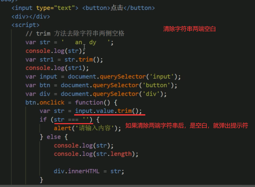 trim()方法会从一个字符串的**两端删除空白字符**。