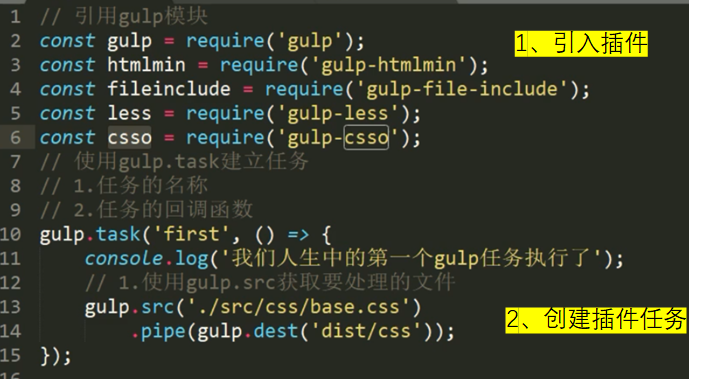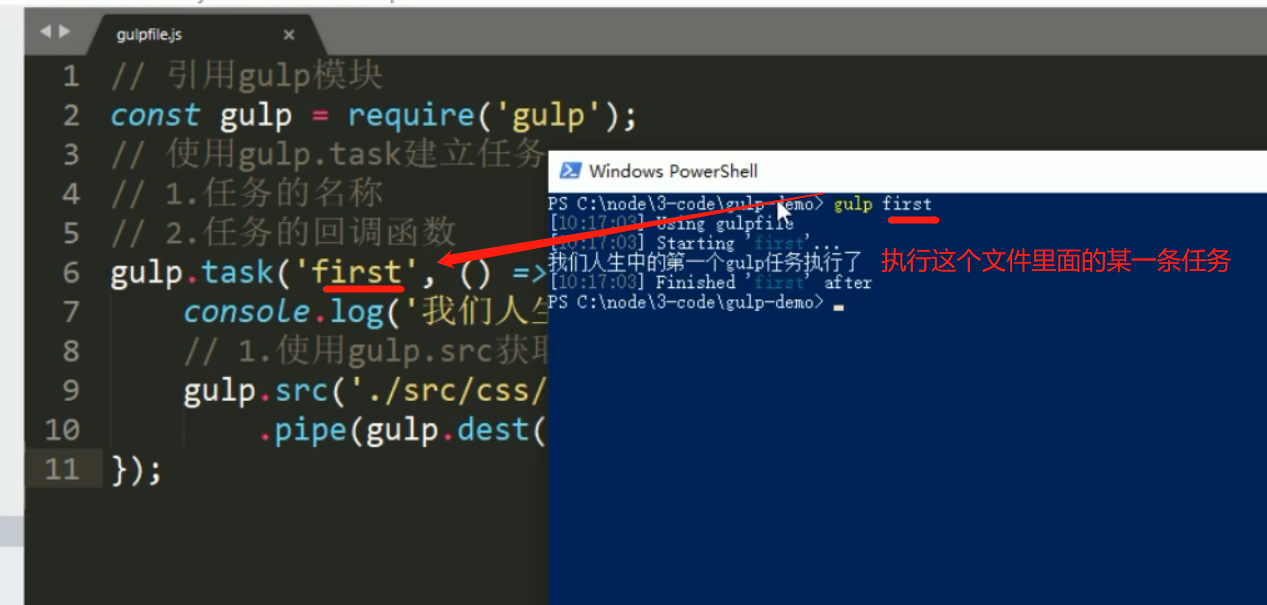 //使用gulp.task()方法建立任务 first(当前任务名字)
