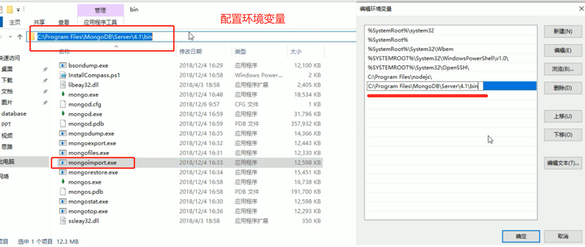 找到mongodb数据库的安装目录,将安装目录下的bin目录放置在环境变量中。
