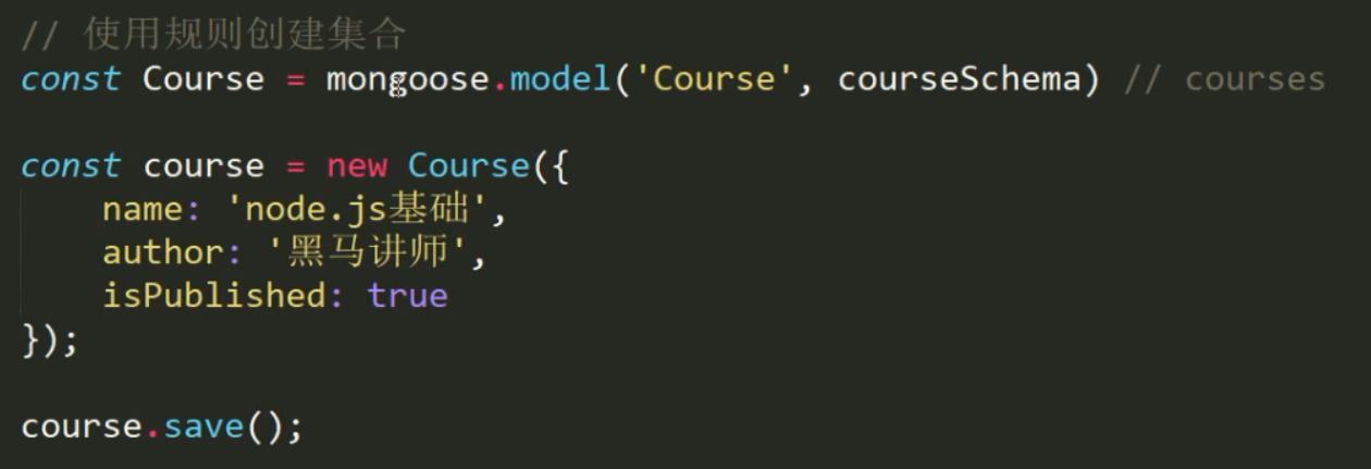 Course.create ({name: ' JavaScript基础',author: ' 黑马讲师',isPublish: true}, (err, doc) => {