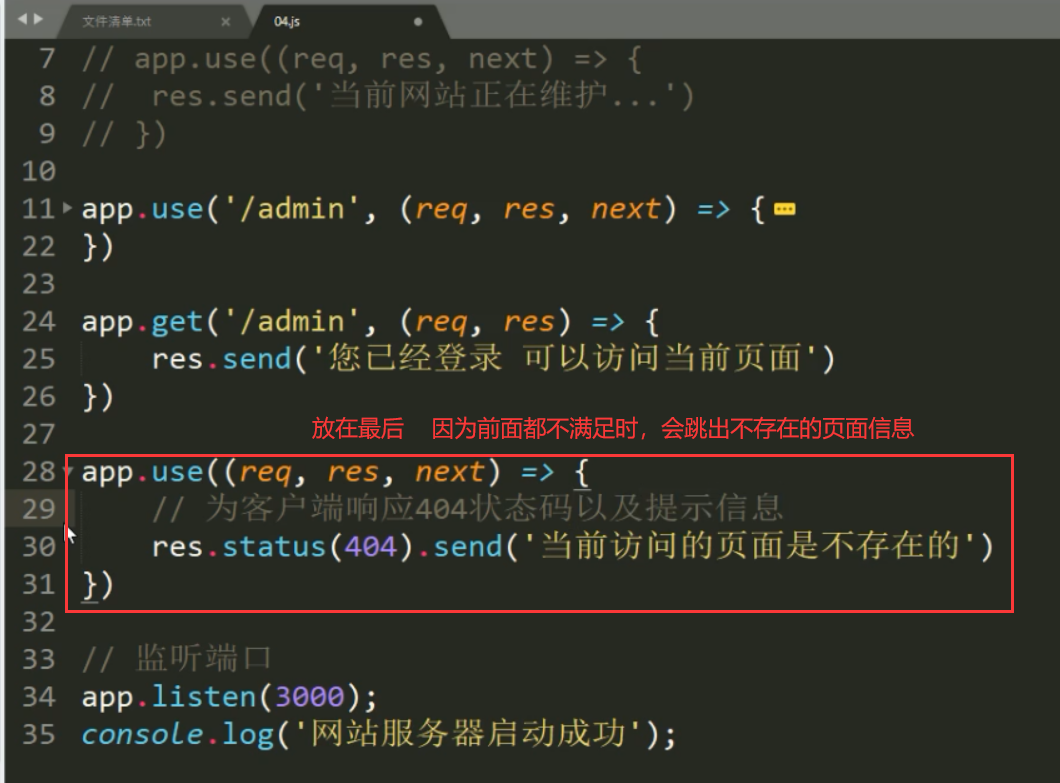 2.网站维护公告, 在所有路由的最上面定义接收所有请求的中间件,直接为客户端做出响应,网站正在维护中。