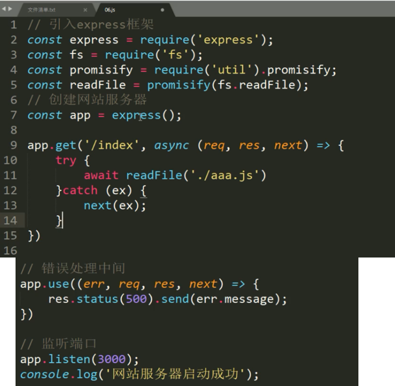 当程序出现错误时,调用next()方法,并且将错误信息通过参数的形式传递给next()方法,即可触发错误处理中间件。