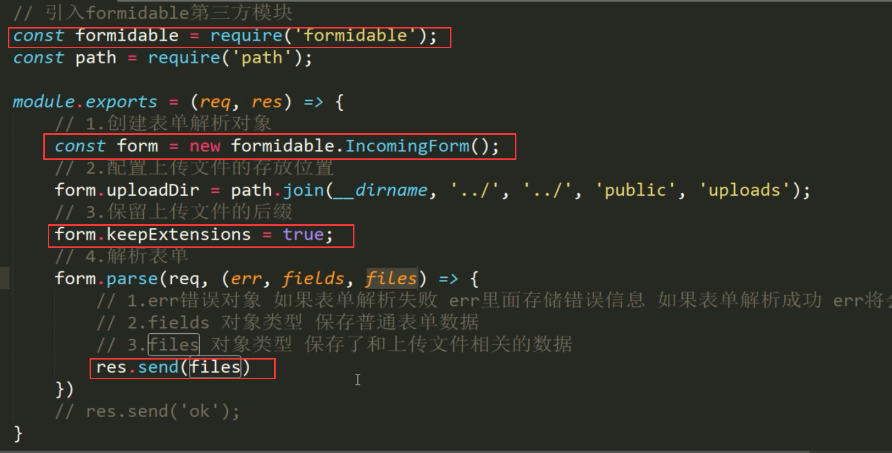 `npm install formidable`作用:解析表单,支持get请求参数,post请求参数、文件上传。
