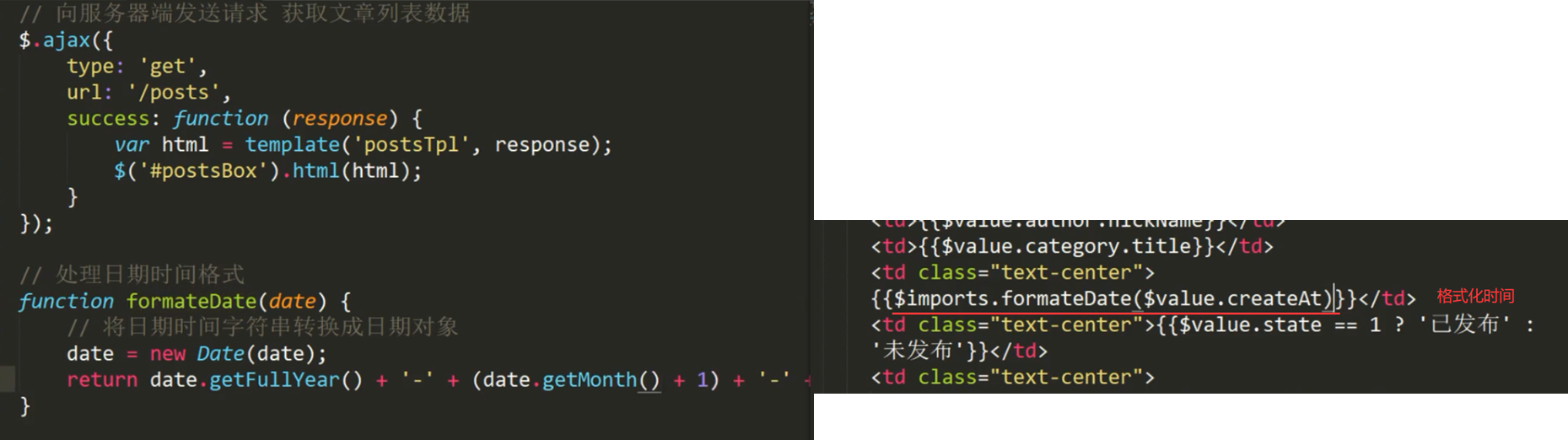 2.通过模板引擎将文章列表数据和HTML进行拼接,拼接完成以后将内容显示在页面中