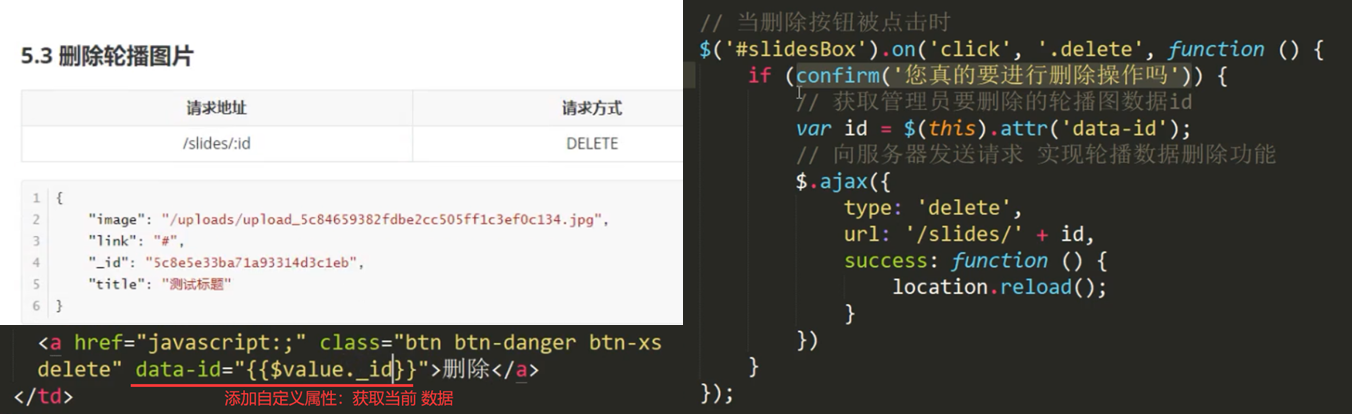 1.给删除按钮添加自定义属性,获取当前数据属性