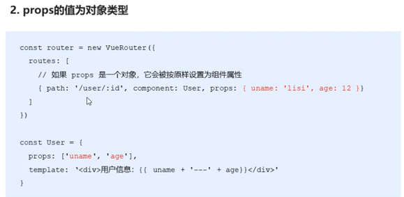 { path: ' /user/: id',component: User, props: { uname: 'lisi',age: 12 } }