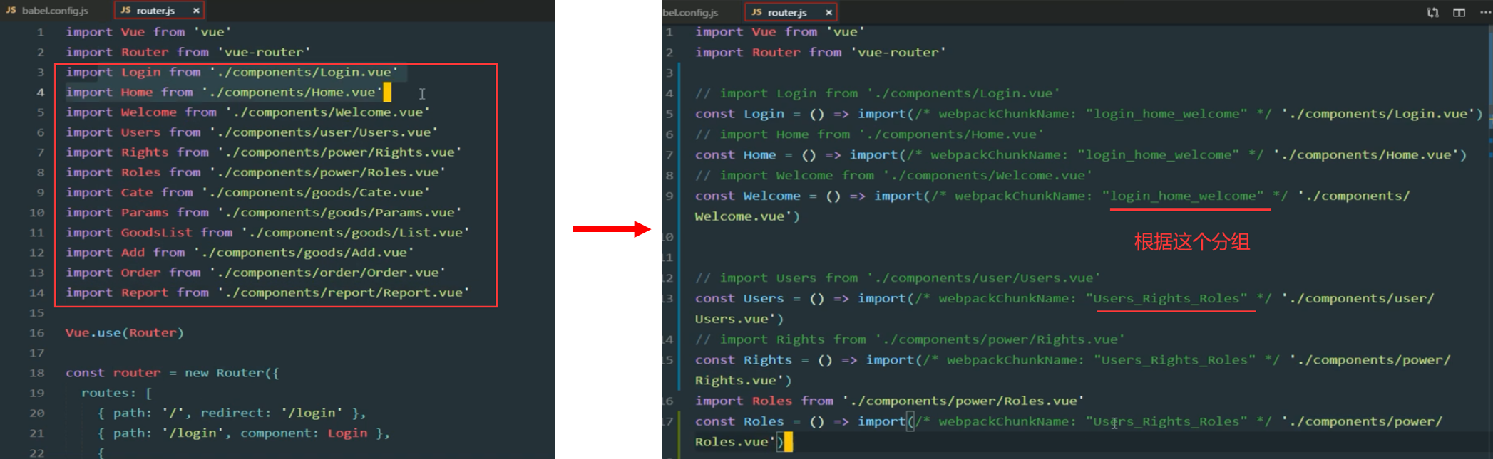 ### 3、将路由改为按需加载的形式,示例代码如下: