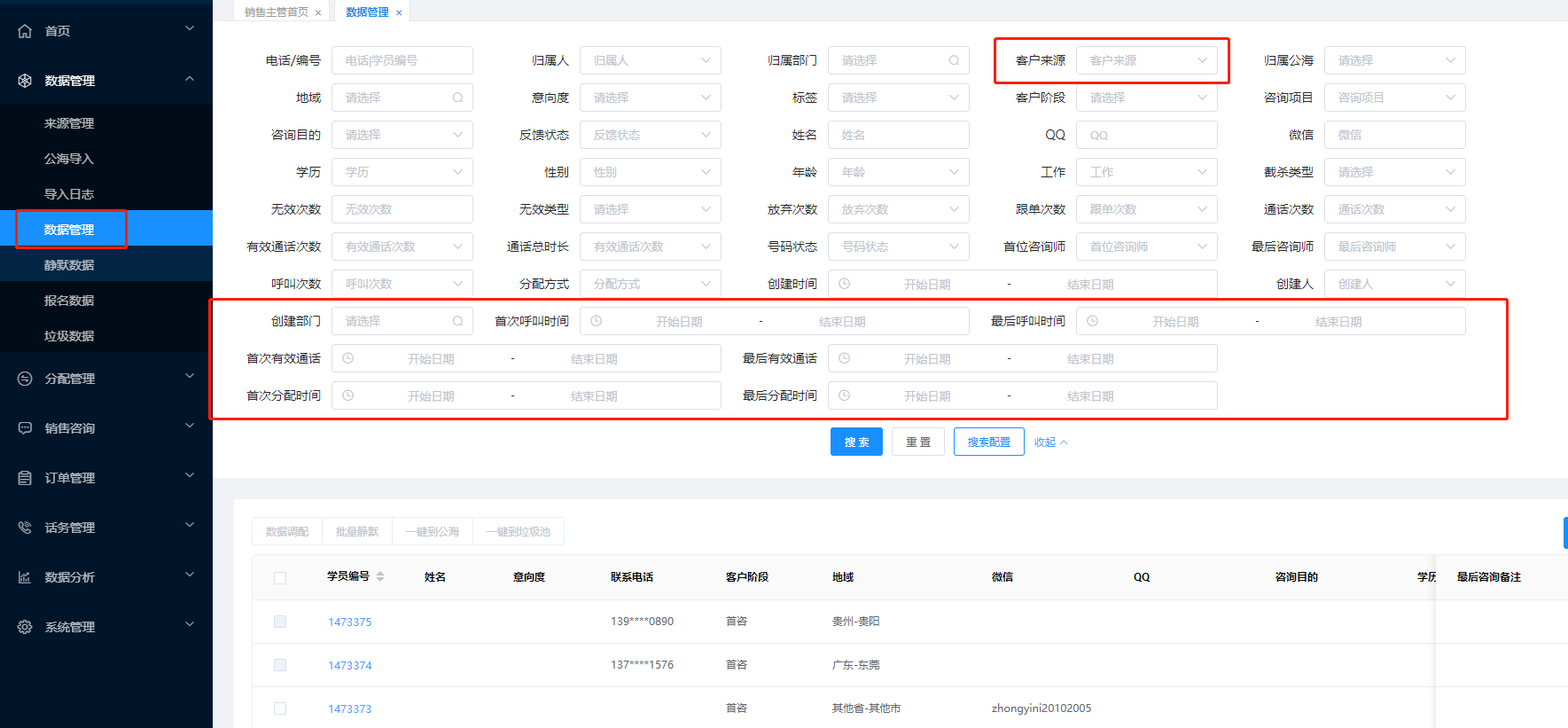 在销售咨询平台左侧菜单找到 数据管理——数据管理