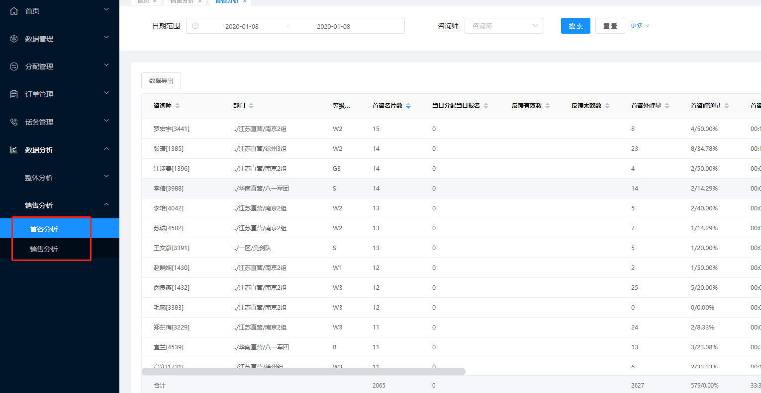 在销售咨询平台,左侧菜单找到 数据管理——销售分析——首咨分析